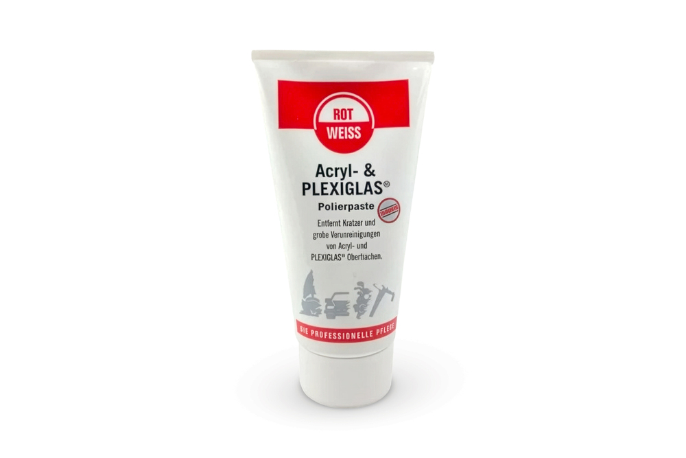 Leštící pasta na plexisklo umožňuje vyleštit menší škrábance a zmatněné povrchy desek PLEXIGLAS®. Protože akrylát značky PLEXIGLAS® nemá na žádné straně UV filtr (nepotřebuje ho) je možné tyto desky jako jedny z mála plastů leštit, aniž by časem došlo k jejich poškození vlivem UV záření (stárnutí, žloutnutí apod.). K leštění plexiskla používejte např. filcový kotouč a vrtačku. Pasta nezpůsobuje vnitřní pnutí v materiálu.